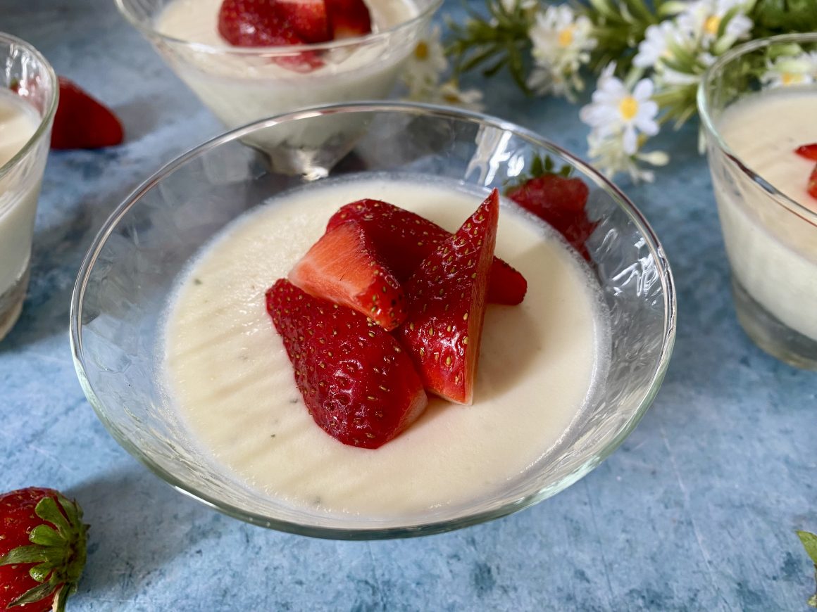 Servez les panna cotta au yaourt avec une belle cuillère à soupe de fraises.